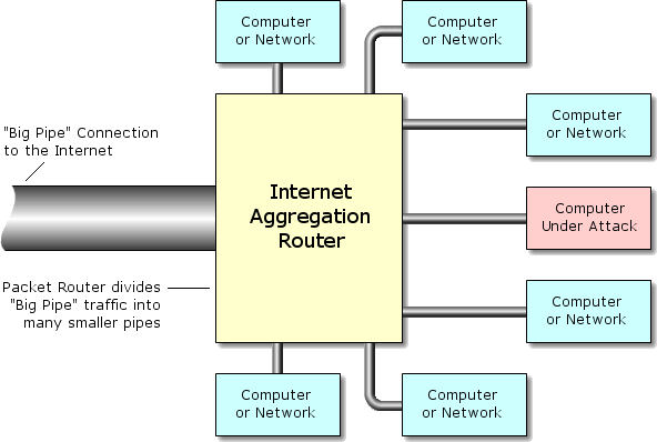 Discarding packets The diagram above helps clarify the consequences of a bandwidth attack. The computers and/or networks shown to the right are serviced by the central "aggregation router." This router is placed at the "customer edge" of the Internet service provider's network to collect and disperse traffic from many smaller customer networks. Thus, many lower-bandwidth Internet connections are "aggregated" into a single high-bandwidth Internet connection for routing to the public Internet. During normal operation, the traffic coming from the Internet down the "Big Pipe" will be sorted and forwarded to the router's various lower bandwidth client networks. But imagine what happens when the Big Pipe is filled by a high volume of packets bound for just one of the router's client networks. Faced with the task of squeezing too many packets from the big pipe into the much smaller pipe, the router has no choice but to deliberately drop and discard a large percentage of the packets struggling to get through the smaller pipe. Valid Internet clients, trying to access the resources on the far side of the smaller pipe, will resend their dropped packets. But these clients will generally give up after a few attempts. The victim's network is effectively blasted off the Internet by the flood of malicious traffic. |