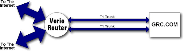 | As you can see from the schematic diagram above, the Verio (our ISP) router that supplies our T1 trunks enjoys two massive 100 megabit connections to the Internet. But from there all of the traffic bound for us must be funnelled through our two T1 trunks. Therefore, in order for the congestion of our T1's to be relieved of the malicious traffic, the "bad packets" had to be filtered before they left Verio's router. In this way, the packet flood would be stopped at a high-bandwidth point upstream of the T1 choke point thus allowing the "good packets" to slip past the bad packets and cross our T1's in peace.